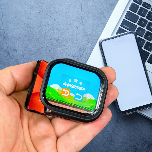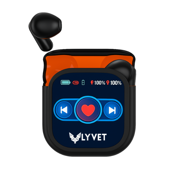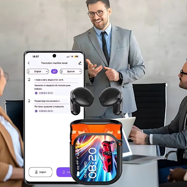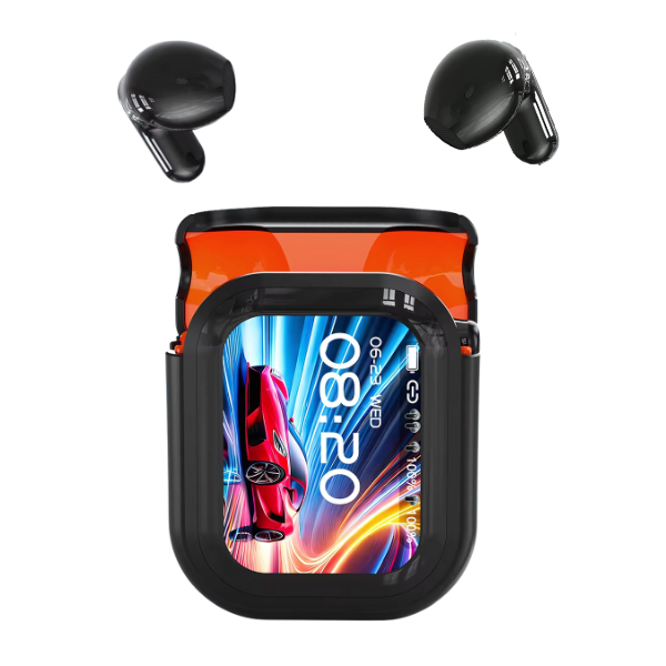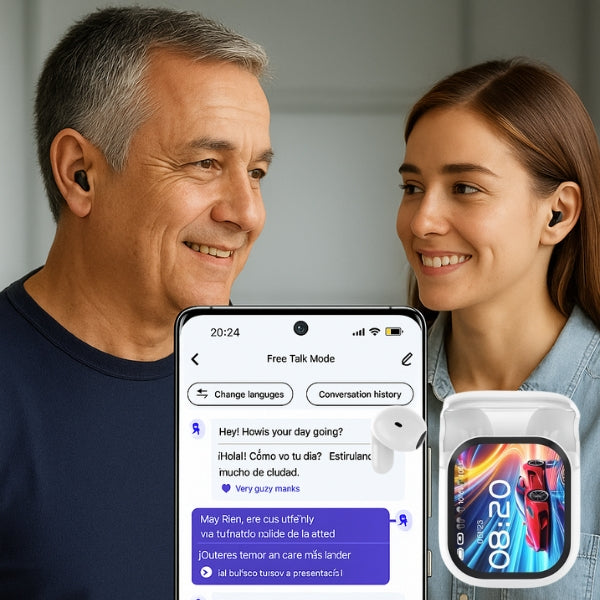 Auriculares abiertos con pantalla LCD, traducción simultánea y estilo minimalista.
