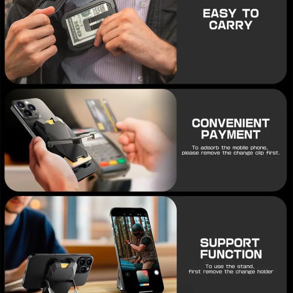Pero la funcionalidad del MagWallet Pro va más allá. Su innovador diseño incorpora un soporte para smartphone que te permite colocar tu iPhone en el ángulo de visión perfecto para videollamadas, ver contenido multimedia o seguir recetas sin usar las manos. Es el compañero ideal tanto para el trabajo como para el ocio, adaptándose a tus necesidades en cualquier momento y lugar.